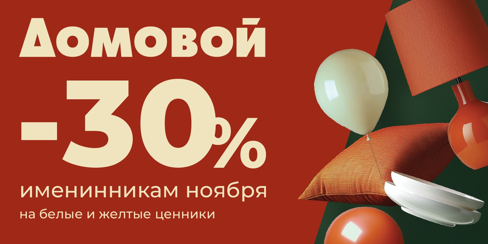 * Скидка 30%* предоставляется именинникам в период текущего календарного месяца при предъявлении дисконтной карты «Домовой» на кассе до оплаты покупок и применяется автоматически, если в анкете покупателя указана дата рождения, соответствующая текущему календарному месяцу.
